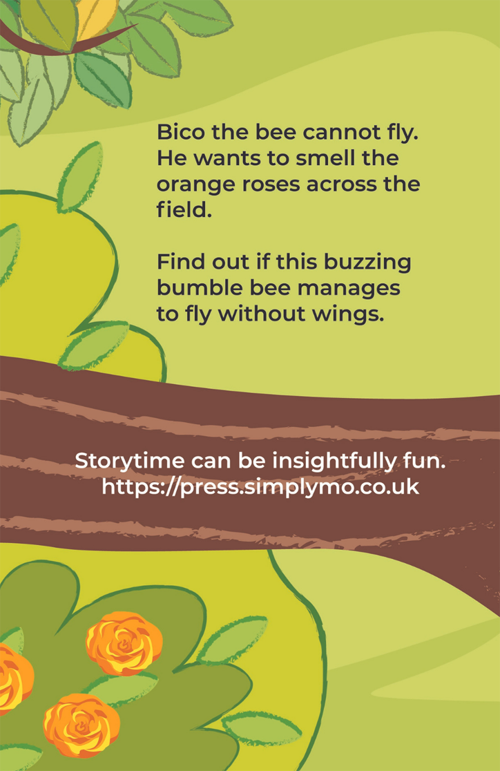 Bico the bee cannot fly. He wants to smell the orange roses across the field. Find out how this buzzing bumble bee manages to fly without wings. This illustrated children’s book teaches children how to deal with challenges, disability and have the courage to ask for help when needed. It also teaches about trying out ideas. While enjoying this sweet and appealing story, kids will also learn about friendship. Book details: Perfect for all ages, 3-6, preschool, and kindergarten Engages young children with beautiful illustrations Written in fun rhyme with an inspiring message Great for bedtime stories, group reading, and one-on-one It makes an ideal gift for your child, grandchild, niece or nephew. If you are searching for a delightful story, then “Bico the bee with no wings” is for you!